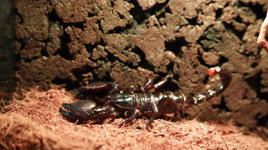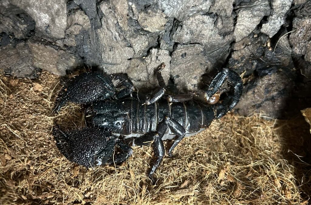 Pandinurus exitialis to duży, masywny skorpion pochodzący z Afryki Wschodniej. Dorasta do około 12–15 cm długości i charakteryzuje się spokojnym usposobieniem. Preferuje wyższe temperatury (25–30°C) oraz umiarkowaną wilgotność (60–70%), nieco niższą niż Heterometrusy. Gatunek o słabym jadzie, polecany dla początkujących, choć ze względu na swoje rozmiary wymaga odpowiednio przestronnego terrarium i grubszego podłoża do kopania. Aczkolwiek moje nie zakopują się wcale, najczęściej okupują miejsce, przy którym doczepione jest ogrzewanie – mata grzewcza bądź kabel. Takie z nich ciepłolubne gagatki. Osobiście jest to jeden z moich ulubionych gatunków. Po prostu trzeba mieć!